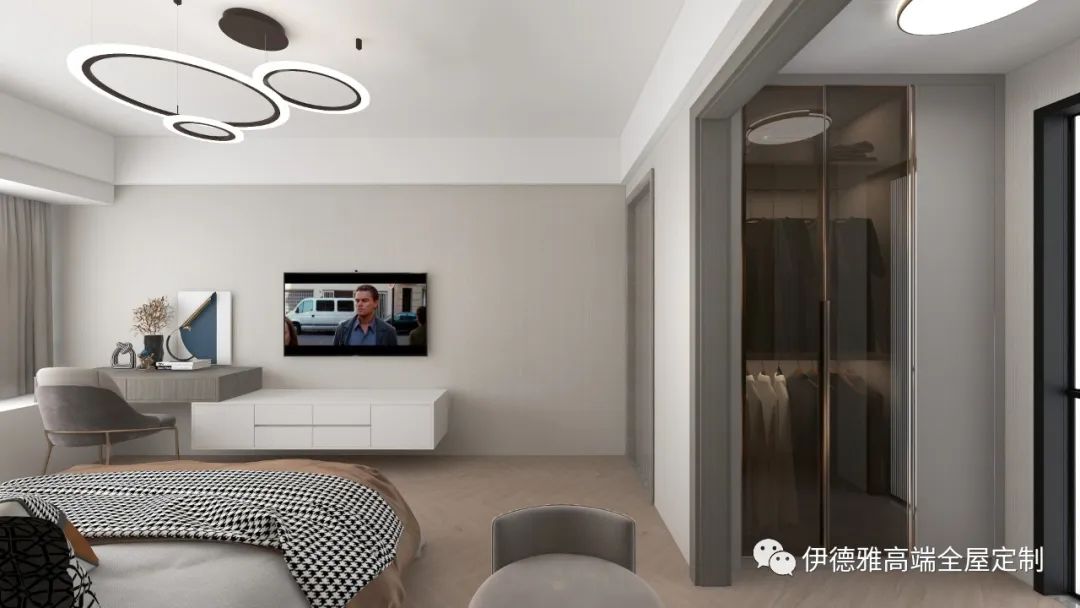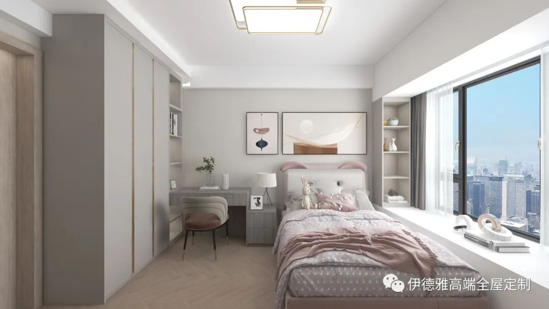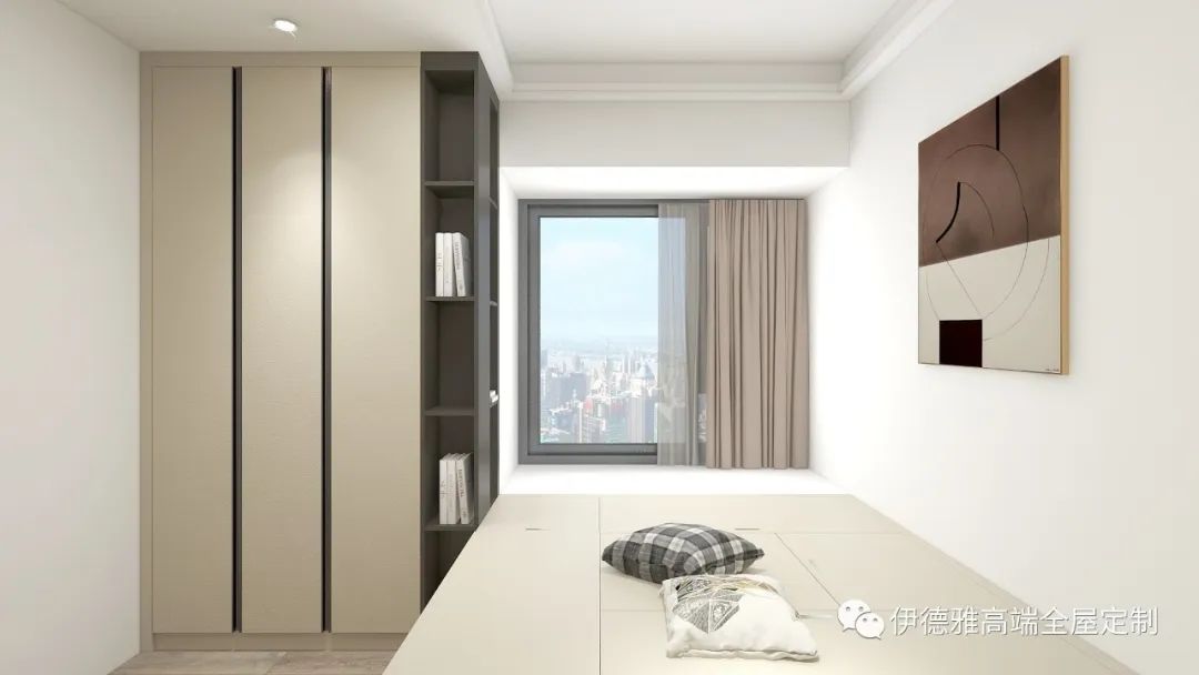 增加了兩格玻璃柜的設計,降低了一門到頂式衣柜的壓迫感,里面放上常穿衣物,方便實用,也給房間帶來了一些趣味性。