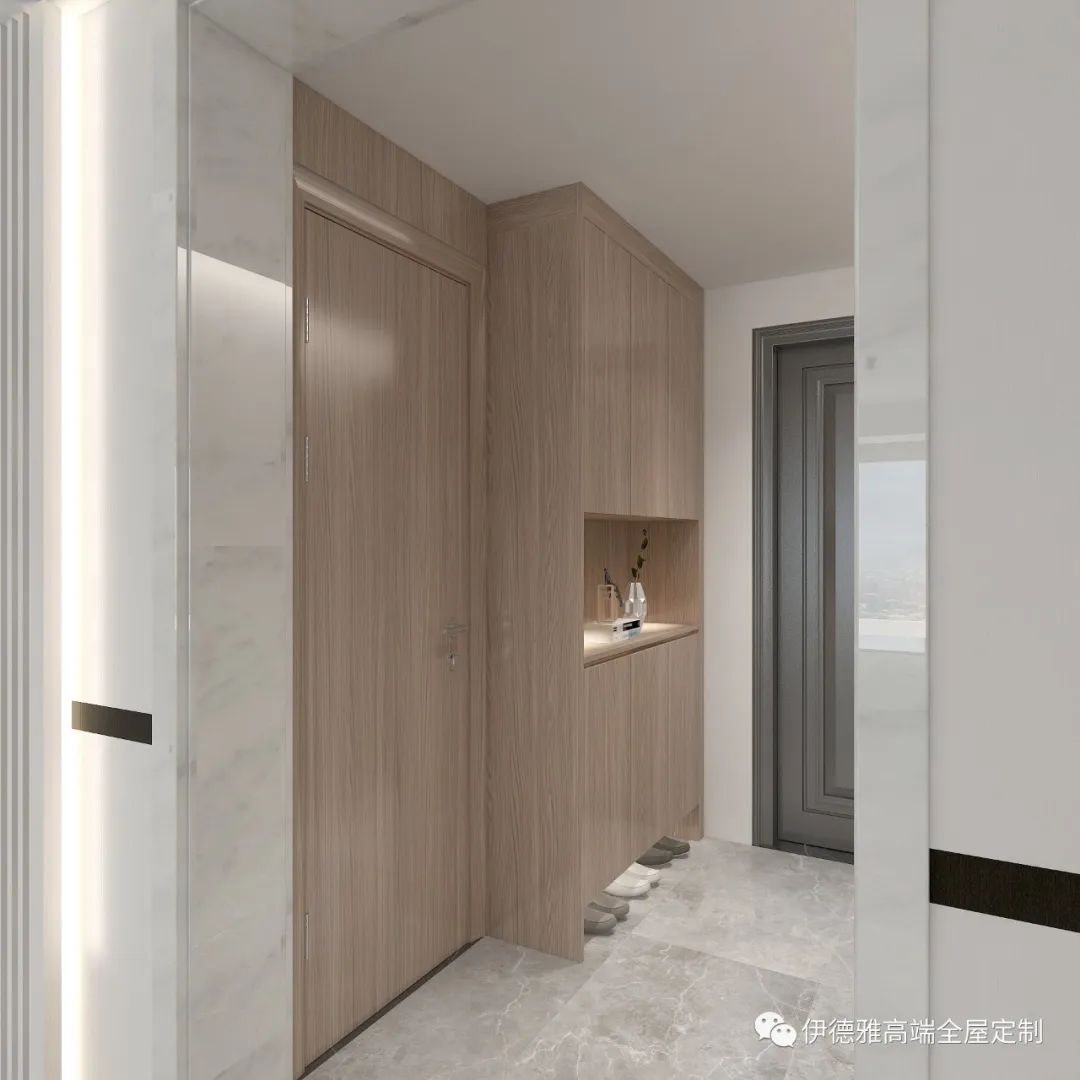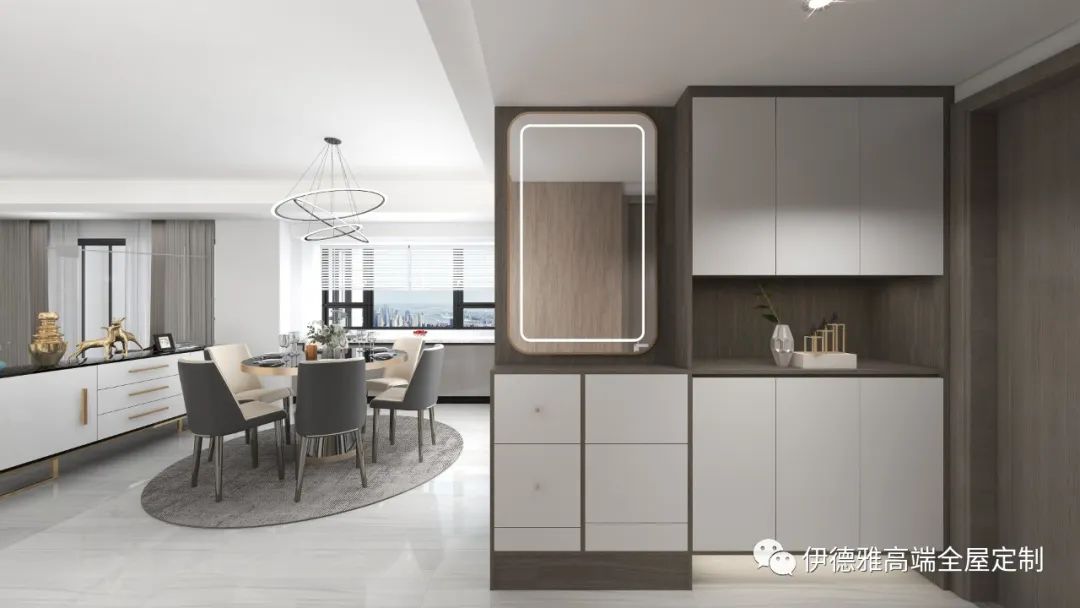人來燈亮,從換鞋更衣開始,家的歸屬感油然而生。玄關是回家的儀式感,如此設計更是有了出門的儀式感。玄關設計特別精簡,利用玄關處的墻面定制整面的鏡面,玄關柜內嵌方式,一改呆板的視覺感,疲憊歸家時,瞬間即能感受到:這里是我的家,我的港灣。