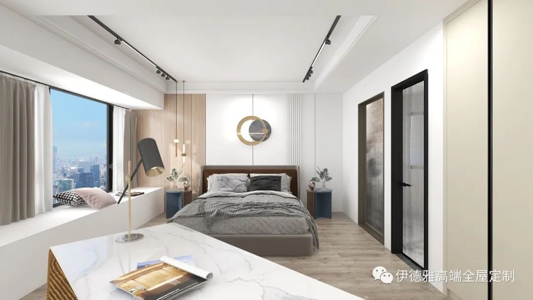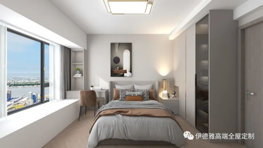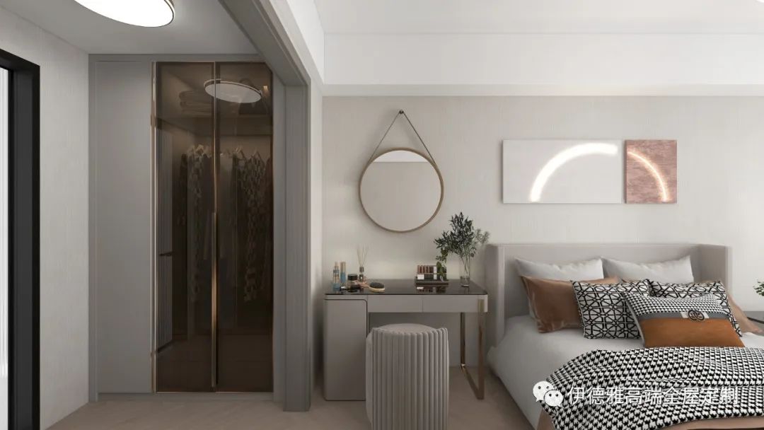 主臥的衣柜與背景墻的顏色風格相統一,提高了整個空間的一致性,也打造出明亮、舒適、高顏值的臥室空間。