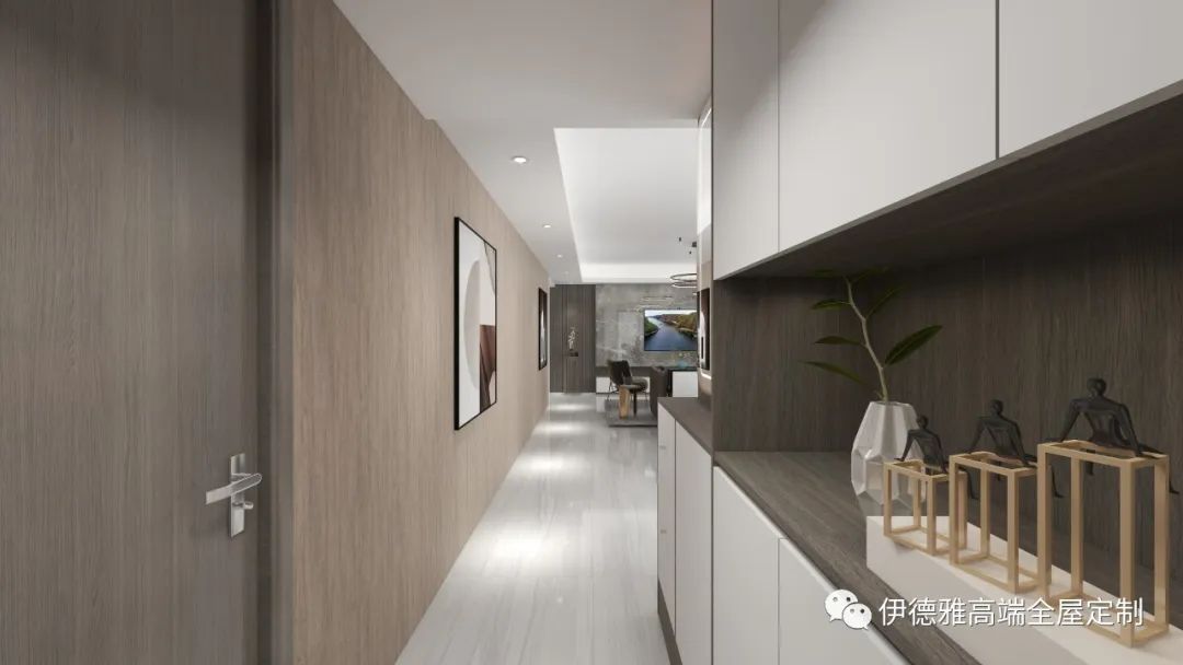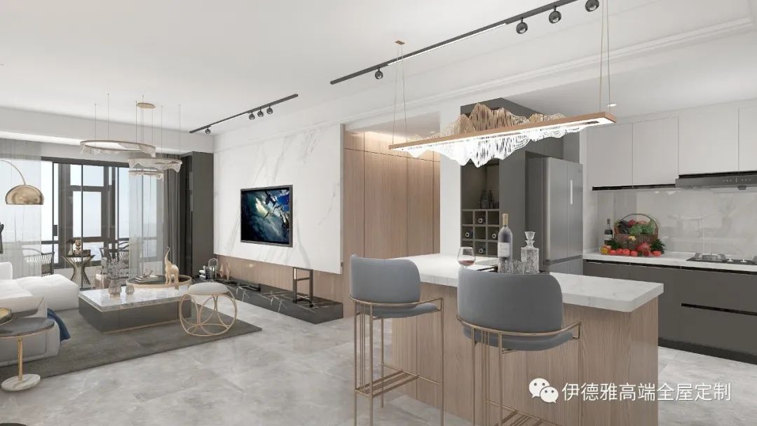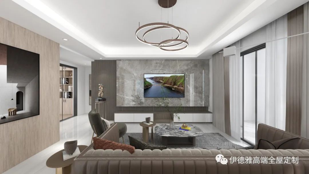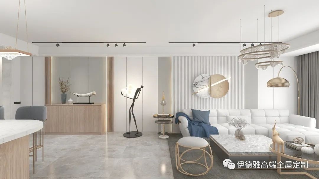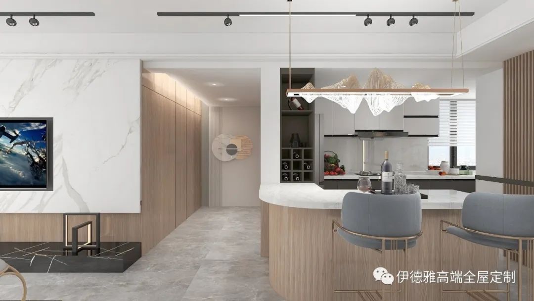 客廳整體色調選擇純白色,視覺上提高了空間的明亮度,木飾面的包裹下是純粹、內斂的表達,木紋的豐盈肌理與通透的玻璃,暖燈之下將功能性與空間美感展現的淋漓盡致。