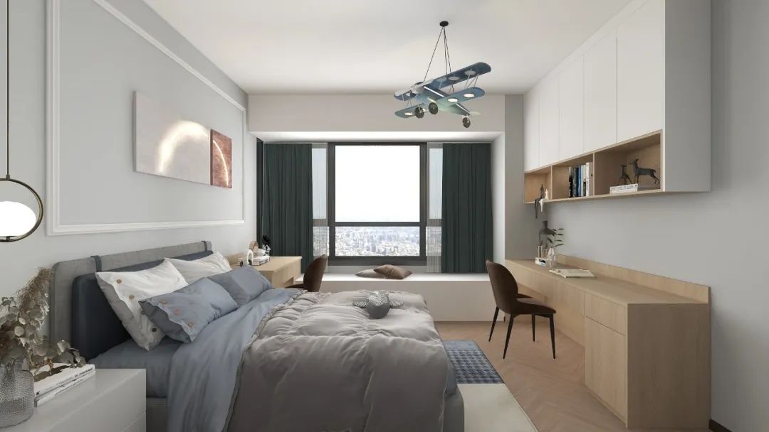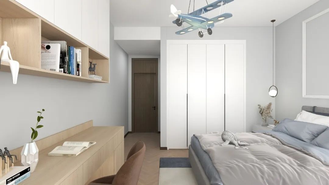 兒童房空間演繹簡潔時尚的日常,嵌入式衣柜和墻面融為一體,讓房間看起來更加整體,不顯突兀,和諧美觀、清新舒適。