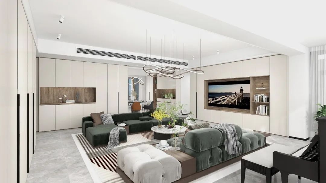 一字電視柜+回型沙發(fā)的超簡組合,配上大理石茶幾,同色系電視背景墻+窗簾,高級空曠敞亮的“味道”,絕了!可以想象,再過5年、10年,也是這種經典視角!