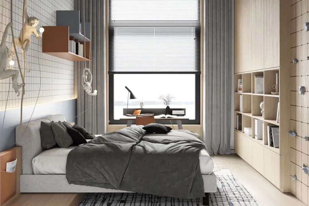 父母設計時一定要考慮孩子是否有足夠的活動空間,以滿足生活需求、提高空間利用率為根本,在有限的空間尺寸下,將活動區、學習區、收納區等功能做到最大化。
