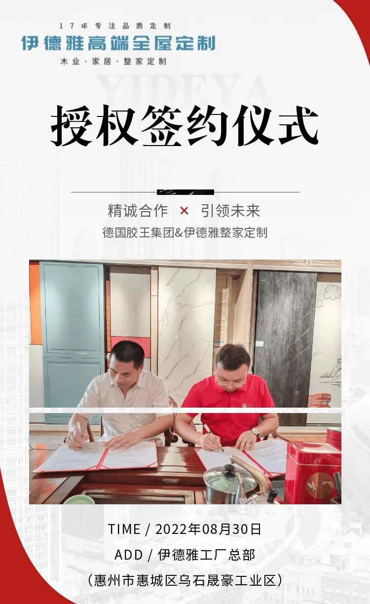 “共造綠色家居,引領健康生活”。2022年8月30日,伊德雅全屋定制與全球頂級膠水供應商德國膠王戰略合作授牌儀式在伊德雅工廠總部順利舉行,開啟雙方在家居領域合作共贏、共造綠色健康家居。