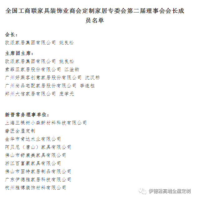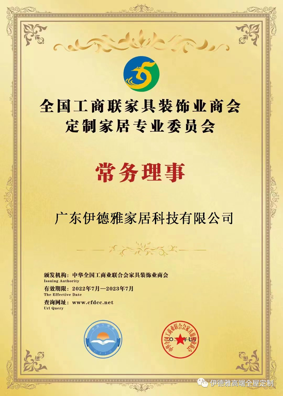 國工商聯家具裝飾業商會《健康整家定制評價標準》啟動會上,廣東伊德雅高端全屋定制有限公司被授予全國工商聯家具裝飾業商會定制家居專業委員會新晉常務理事單位,參與商會日常事務,發揮企業的社會影響力,積極促進行業健康發展與良性循環,為消費者提供一站式整體空間解決方案及未來生活方式的生活服務。