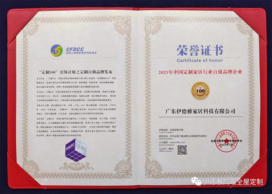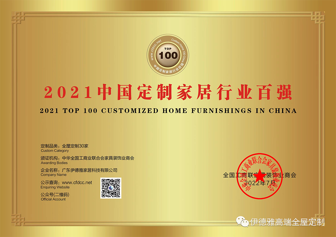 伊德雅高端全屋定制 憑借2021年度的超強引領力、創造力,榮登“2021中國定制家居百強品牌企業”榜單。這是行業賦予的責任,更是消費者給予的信心。